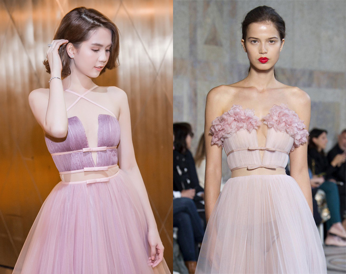 Ngọc Trinh xuất hiện nổi bật trên thảm đỏ đêm chung kết Hoa hậu Áo dài Việt Nam 2017 khi diện chiếc váy xốp nhẹ bồng bềnh, kết hoa lãng mạn do Đỗ Long thực hiện bị nghi "đạo ý tưởng".