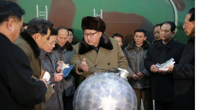 Nhà lãnh đạo Triều Tiên Kim Jong-un bên cạnh cái được cho là đầu đạn hạt nhân thu nhỏ hồi tháng 3/2016. Ảnh: KCNA