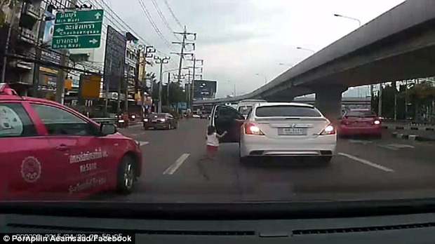 Lúc này, một người phụ nữ trên ô tô mới cuống cuồng nhoài người ra và bế cô bé vào trong trước khi đóng cửa đi tiếp.