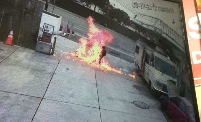 Một người khác, cầm bình chữa cháy xịt vào chiếc xe đang cháy, cũng không ăn thua gì luôn, và thế là chiếc xe từ từ cháy rụi, làm hư cả mái của cây xăng và hai trạm đổ xăng.
