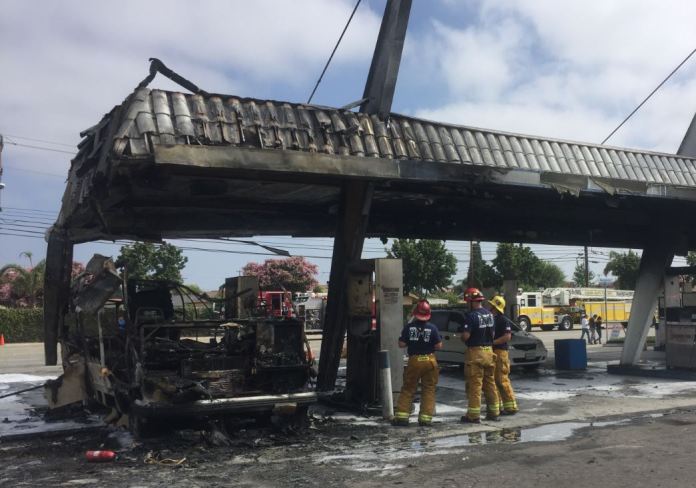 Chiếc xe RV bị cháy rụi tại cây xăng G & H Gas.