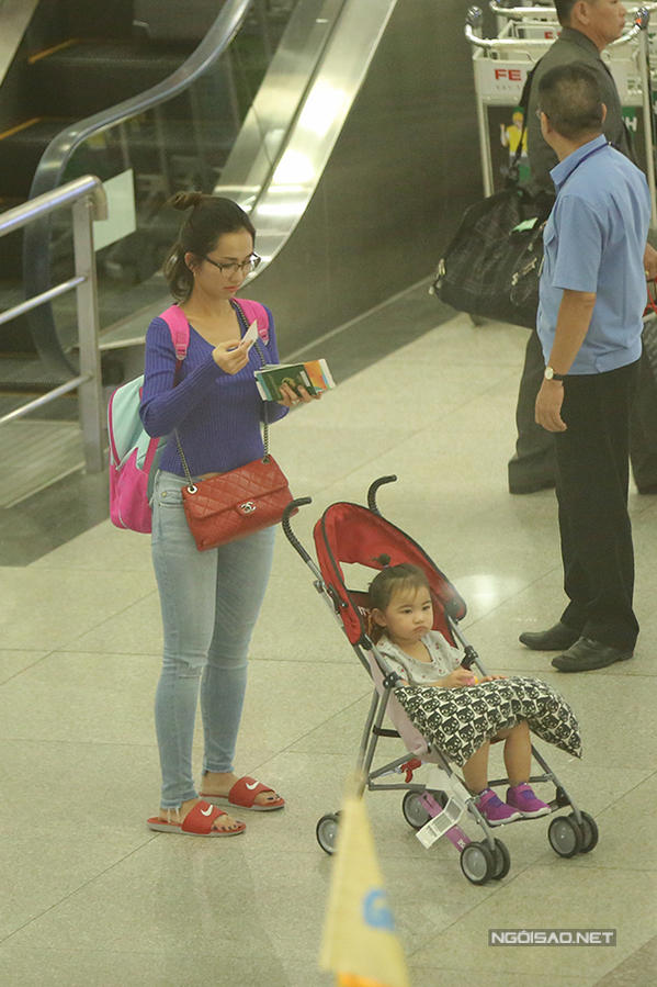 Trong lúc chờ lấy hành lý, nữ diễn viên vừa bế con gái Yvona vừa trò chuyện với một vị khách. Sau chặng bay dài từ Mỹ, nàng công chúa nhỏ tỏ ra hơi mệt và đói bụng.