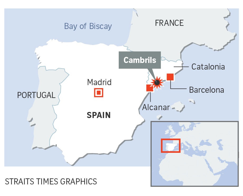 3 vụ việc liên tiếp xảy ra cùng một ngày tại 3 địa phương thuộc vùng Catalan, Tây Ban Nha. Đồ họa: Straits Times.