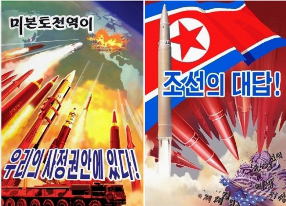 Ba bức tranh cổ động được hãng thông tấn KCNA công bố hôm 17/8 là diễn biến mới nhất trong tình hình căng thẳng có dấu hiệu hạ nhiệt, sau khi Bình Nhưỡng tuyên bố cả nước Mỹ giờ đã nằm trong tầm tấn công của tên lửa đạn đạo liên lục địa (ICBM) Triều Tiên.
