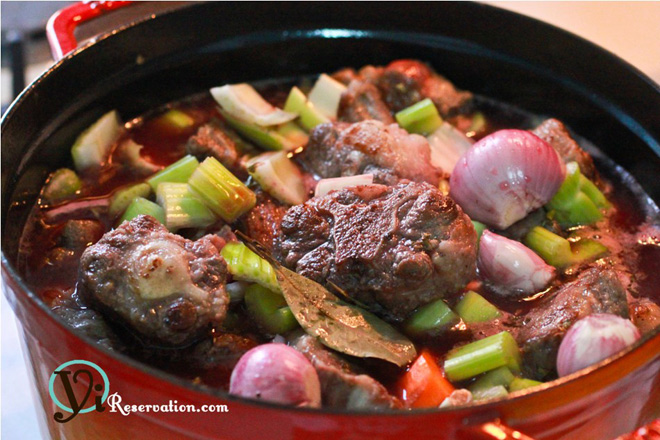 Vừa đảo đều vừa từ từ đổ rượu vang đỏ vào cho đến khi ngập mặt tất cả các nguyên liệu. Đun đến khi sôi rồi bắc ra khỏi bếp. Đậy nắp nồi lại và đặt vào lò nướng để om trong khoảng 2 giờ. Kiểm tra độ chín của thịt và lắc nhẹ nồi để tránh dính.