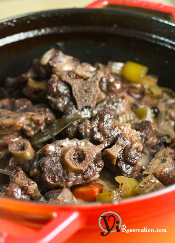 Làm nóng lò nướng đến 150oC. Trên bếp, đun nóng một nồi gang (Dutch oven) và thêm một thìa canh dầu ăn. Lần lượt rán chín vàng cả hai mặt của từng miếng đuôi bò đã ngấm gia vị trong khoảng 4 phút cho mỗi bên. Gắp đuôi bò ra và đặt sang một bên.