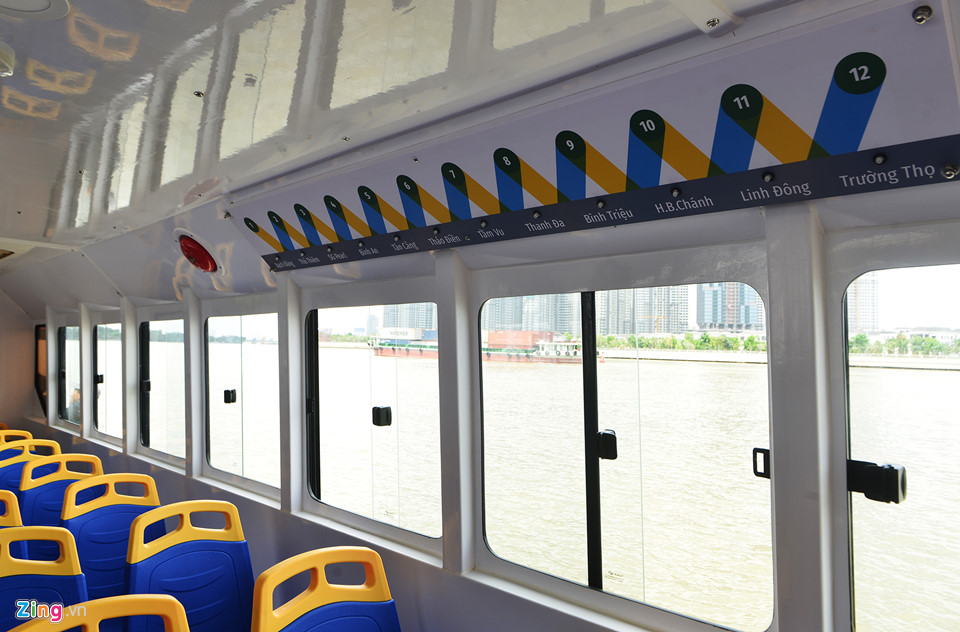Hai bên hông phòng khách ngồi gắn tên 12 bến, trong đó 9 bến chính thức và 3 bến bổ sung gồm Bạch Đằng - Thủ Thiêm - SG Pearl - Bình An - Tân Cảng - Thảo Điền - Tầm Vu - Thanh Đa- Bình Triệu - Hiệp Bình Chánh - Linh Đông - Trường Thọ. Đèn tín hiệu sẽ nhấp nháy khi tới bến. Các cửa kính được thiết kế rộng, khách vừa có thể di chuyển vừa ngắm cảnh hai bên bờ sông.