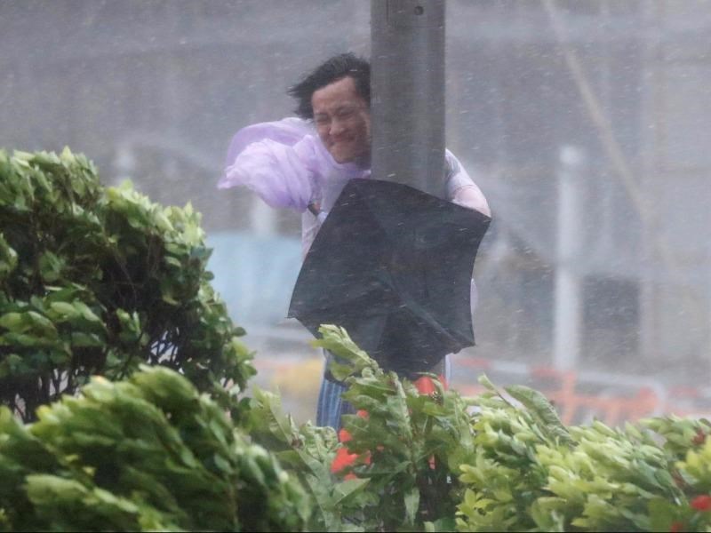 Một người Hong Kong ôm cột đèn vì gió thổi quá mạnh. Ảnh: REUTERS