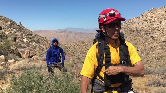 Ông Gilbert Orbeso, ở đằng sau, đang tìm kiếm dấu vết của con và bạn của con tại công viên quốc gia Joshua Tree ngày thứ Bảy, 19 tháng Tám. (Desert Sun)