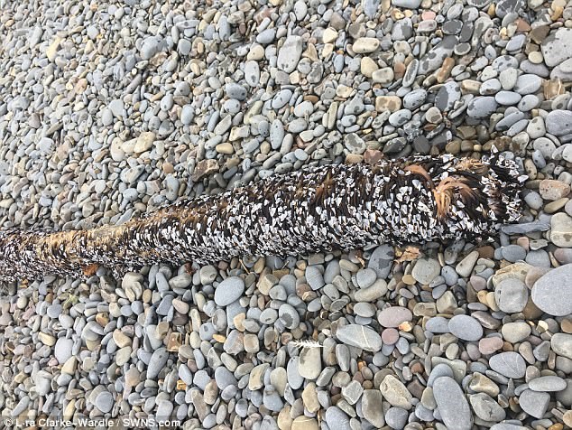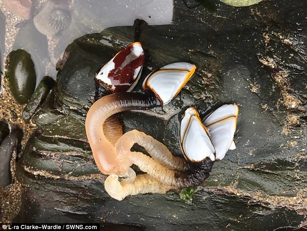 Lara nhìn thấy những sinh vật kỳ lạ bám đầy một khúc gỗ mục trên bãi biển. Ảnh: LARA CLARKE-WARDLE