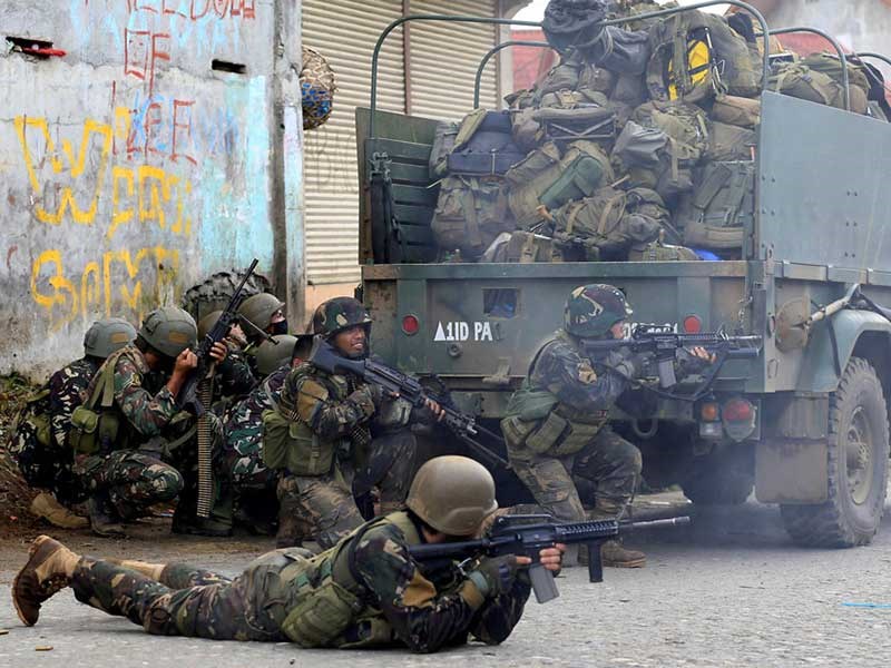 Một nhóm quân chính phủ Philippines tác chiến trên đường phố Marawi. Ảnh: REUTERS