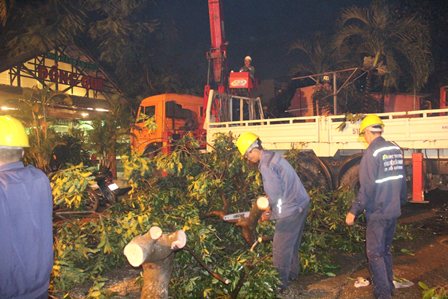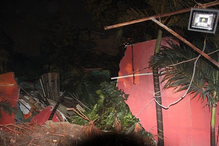 Tại hiện trường, cây xanh dài khoảng 20m, đường kính 1,2m đè 4 ngôi nhà cùng số 652 đổ sập hoàn toàn, đồ đạc hư hỏng nặng. 3 ngôi nhà còn lại cũng bị hư hỏng hoàn toàn phần mái nhà.