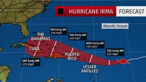 NHC dự báo Irma đổ bộ các quốc đảo Antigua và Barbuda, St. Kitts và Nevis, và Anguilla vào sáng sớm 6/9 và quần đảo Virgin thuộc Mỹ, Puerto Rico vào chiều cùng ngày. Đường đi dự báo hiện tại cho thấy Irma có thể hướng đến và đổ bộ bang Florida, Mỹ, vào cuối tuần.