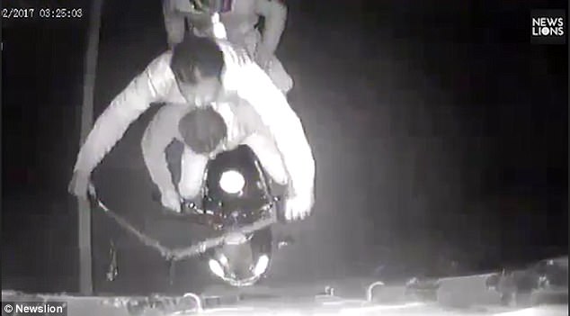 Mọi chuyện vẫn êm xuôi cho tới khi tên cướp trèo lên được chiếc xe tải và chuẩn bị mở ngăn chứa thì bất ngờ hai tên đằng sau loạng choạng và ngã nhào ra đất. Tờ Daily Mail cho rằng do cú nhảy của đồng bọn quá mạnh khiến hai kẻ điều khiển xe máy không làm chủ được phương tiện và ngã ra đất.