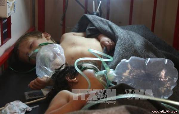 Trẻ em được điều trị tại một bệnh viện ở Maaret al-Noman, tỉnh Idlib, miền bắc Syria sau khi có những dấu hiệu nghi phơi nhiễm chất độc sarin.