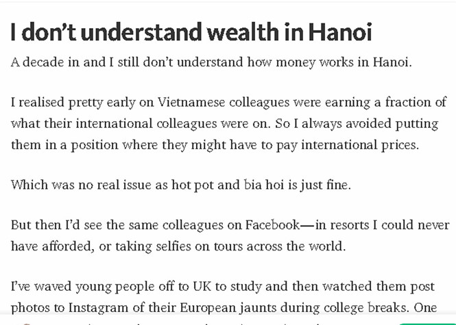 Người Việt và đặc biệt là giới trẻ Việt nam hiện nay thường xuyên khoe cuộc sống sang chảnh trên mạng xã hội. Thế nhưng số tiền mỗi tháng kiếm được bình quân mỗi người chỉ có vài trăm USD. Một người nước ngoài đã sống ở Hà Nội được 10 năm mà vẫn thấy khó hiểu cách kiếm tiền và tiêu tiền của người Việt.