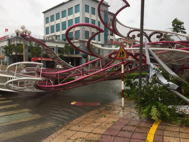 Bão số 10 đã khiến 2 cổng chào ở trung tâm TP Đồng Hới đổ sập hoàn toàn. Được biết, đây là công trình được tỉnh Quảng Bình mới đầu tư giữa năm 2016 để phục vụ cho lễ hội du lịch của tỉnh. Hệ thống công trình này lên đến nhiều tỷ đồng.