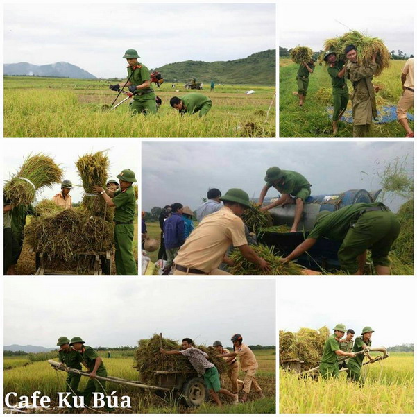 5.Ngày hôm qua, một ngày tình cờ ở một tỉnh nghèo ở miền Trung, Dân làng vô cùng bất ngờ và cảm động khi chứng kiến lực công an và CSGT địa phương bỏ văn phòng máy lạnh của mình ở đồn để xuống ruộng giúp bà con. Không những vậy, mấy anh CSGT cũng tình nguyện bỏ đứng đường vòi tiền, thu nhập cũng vài triệu một ngày, để giúp dân.