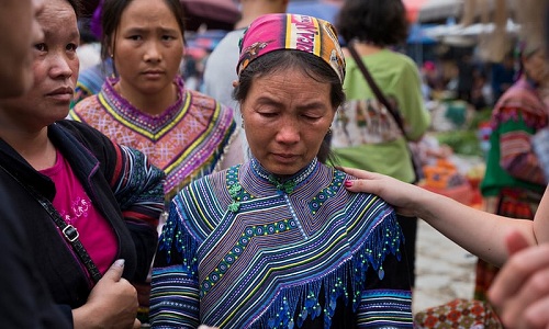 Một người mẹ khóc tại chợ Bắc Hà hồi tháng 6 khi kể về con gái mất tích một năm tại khu chợ. Ảnh: Guardian.