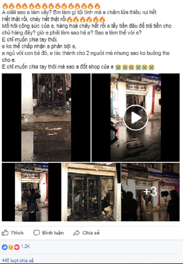 Sau khi nói lời chia tay với bạn trai, cô nàng H đã vô cùng đau khổ khi anh chàng này thiêu rụi quán quần áo của mình. Sự việc này đã thu hút sự chú ý của đông đảo cộng đồng mạng. Theo cô gái, do chàng trai cặp kè với người khác, nên cô đã chủ động nói lời chia tay.