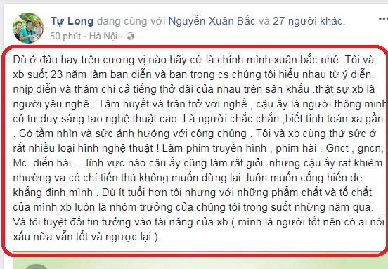 Mới đây nghệ sĩ Tự Long bất ngờ chia sẻ dòng trạng thái nhắn nhủ gắn tên nghệ sĩ Xuân Bắc trên trang cá nhân của mình. Anh viết: "Dù ở đâu hay trên cương vị nào hãy cứ là chính mình Xuân Bắc nhé. Tôi và Xuân Bắc suốt 23 năm làm bạn diễn và bạn trong cuộc sống, chúng tôi hiểu nhau từ ý diễn, nhịp diễn và thậm chí cả tiếng thở dài của nhau trên sân khấu. Thật sự Xuân Bắc là người yêu nghề. Tâm huyết và trăn trở với nghề, cậu ấy là người thông minh có tư duy sáng tạo nghệ thuật cao. Là người chắc chắn, biết tính toán xa gần. Có tầm nhìn và sức ảnh hưởng với công chúng.