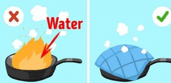 Khi chảo dầu quá nóng, chảo có thể bùng cháy. Trong tình huống này, tuyệt đối không đổ nước để dập lửa vì nó khiến ngọn lửa lớn và khó kiểm soát hơn. Nếu ngọn lửa nhỏ bạn có thể đổ banking soda vào chảo. Cách hữu hiệu và an toàn nhất là dùng tấm vải cotton thật dày để đậy lên miệng chảo.