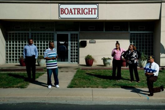 Cảnh chào đón đoàn xe là một người đàn ông quỳ gối trên vỉa hè, trên tay ôm một lá cờ của Mỹ đã được gấp lại.