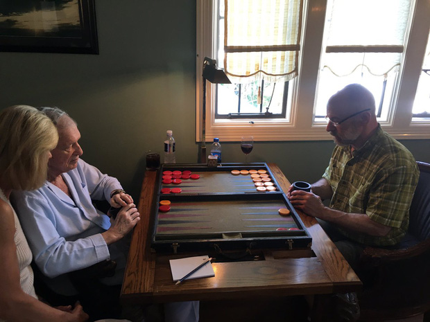 Hình ảnh hiếm hoi của David (bên phải). Cả gia đình Hefner đang chơi cờ backgammon (cờ thỏ cáo), Maston là người chụp ảnh, bên trái là chị cả Christie và người cha Hefner của họ.