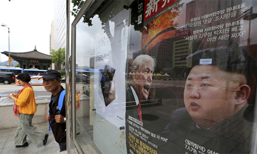 Poster in hình Tổng thống Mỹ Donald Trump và lãnh đạo Triều Tiên Kim Jong-un trên đường phố Seoul, Hàn Quốc. Ảnh: Reuters.