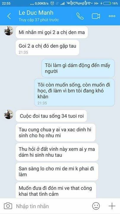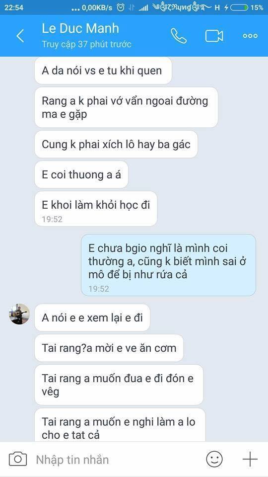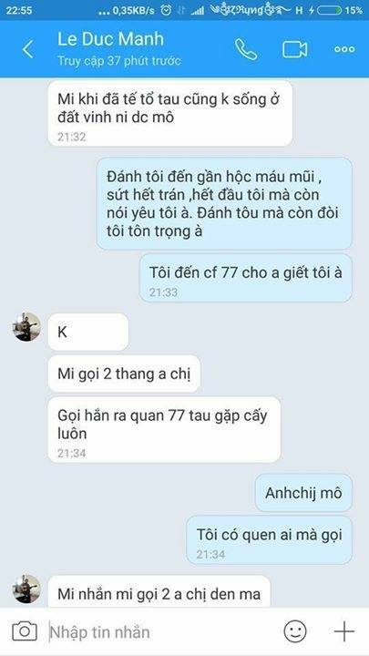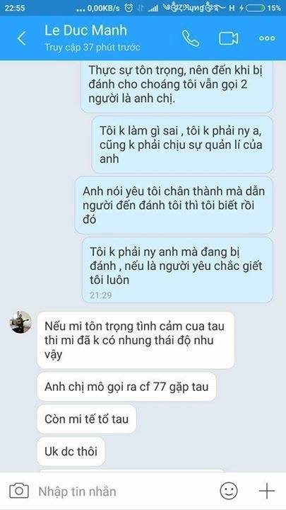 Vào khoảng 20h10 cùng ngày Đại úy Lê Đức Mạnh đến chỗ làm của em để đe doạ và lôi em ra khỏi chỗ làm để cho em gái anh ta đánh! Đồng thời anh ta ôm em, xé áo em và giữ em lại để cho em gái anh ta đánh em! Em bị chảy máu đầu rất nhiều phải đi cấp cứu! Sau khi đánh em xong anh ta còn nhắn tin hăm doạ và chửi em!