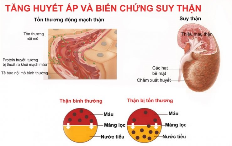 Những biến chứng tại thân bao gồm vữa xơ động mạch thận sớm và nhanh; Xơ thận gây tình trạng suy thận dần dần; Hoại tử dạng tơ huyết tiểu động mạch thận gây tăng huyết áp ác tính.