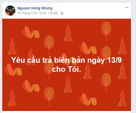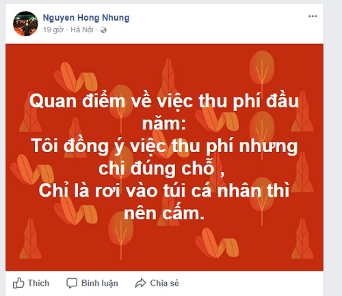 Ngoài đoạn clip, trên trang facebook cá nhân giảng viên Hồng Nhung liên tục chia sẻ quan điểm cá nhân đề cập đến công tác dạy và học tại trường Cao đẳng Nghệ thuật Hà Nội như: "Quan điểm về việc thu phí đầu năm: Tôi đồng ý việc thu phí nhưng chi đúng chỗ, chỉ là rơi vào túi cá nhân thì nên cấm", "Yêu cầu trả biên bản ngày 13.9 cho tôi"...