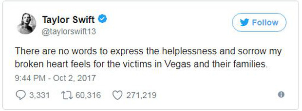 Cô ghi trên Twitter: "Không có từ ngữ nào diễn tả được sự bất lực và nỗi đau buồn từ trong trái tim tan nát của tôi dành cho các nạn nhân ở Vegas và gia đình họ".