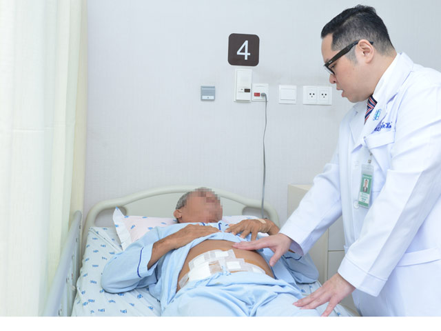 TS BS. Nguyễn Hoàng Đức thăm khám cho bệnh nhân sau mổ.
