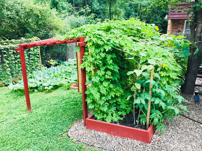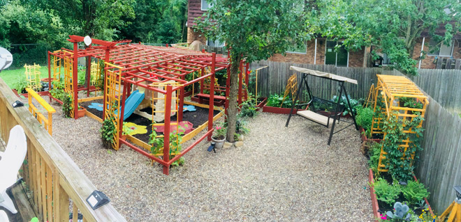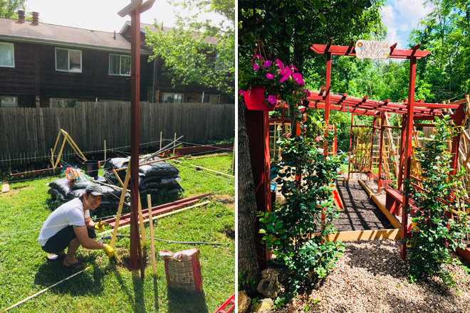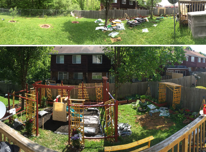 Ban đầu, anh Tuấn, chồng chị Quân, không quan tâm nhiều tới việc làm vườn vì anh thích hoa hơn rau trái. Nhưng khi thấy vợ say mê chăm những luống rau, cây cà, anh quyết tâm quy hoạch vườn tươm tất hơn. Anh tự đi mua gỗ, đóng hộp, giàn để trồng cây, làm xích đu. Gia đình phải mua và vận chuyển cả trăm bao đất để cây phát triển tốt hơn.