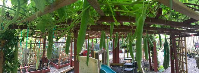 Nữ chủ vườn mát tay thấy hạnh phúc nhất là khi những mầm non phát triển mạnh mẽ trong những chậu ươm và cả khi chị chăm sóc cho chúng đơm hoa, kết trái. Những giàn bầu bí, mướp khá lạ với người dân ở đây. Có lần những người thợ tới sửa ống nước liên tục hỏi đây là trái gì và xin chụp hình cùng giàn quả. Chị Quân thấy rất vui nên biếu họ đôi quả mướp làm kỷ niệm.