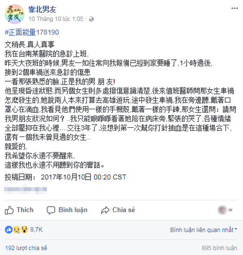 Cô này cho biết vụ việc xảy ra khi cô đang làm ca đêm tại một bệnh viện ở Đài Nam, Đài Loan. Cô nhận được tin nhắn của người bạn trai 3 năm rằng anh ta ở nhà, sắp đi ngủ và cô hoàn toàn tin tưởng bạn trai mình. Tuy nhiên, lòng tin của cô tan rã chỉ một giờ sau đó.