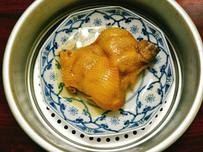 - Bước 3: Thịt sau khi đã ướp đủ thời gian thì cho vào bát to hoặc đĩa sâu lòng (phần da ngửa lên trên) đặt đĩa thịt vào xửng và bật bếp hấp cho tới khi thịt gà chín là được.