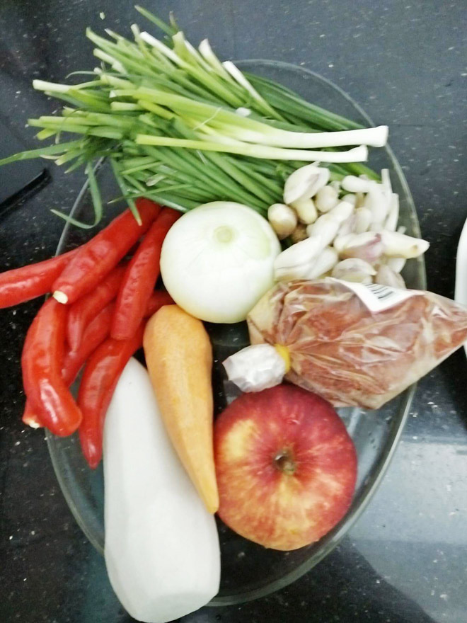 - Hẹ 20g sắt nhuyễn 0,3cm, hành tây 20g, lê hoặc táo 50g
