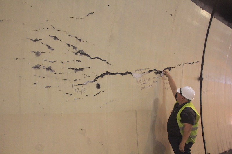 Hàng loạt vết nứt xuất hiện trong hầm Hải Vân từ năm 2014 làm bong tróc lớp sơn epoxy bên ngoài. Tư vấn giám sát dự án liên tục quan trắc, đánh dấu ngay trên vết nứt để theo dõi quá trình biển đối của vết nứt. Ảnh: TẤN VIỆT