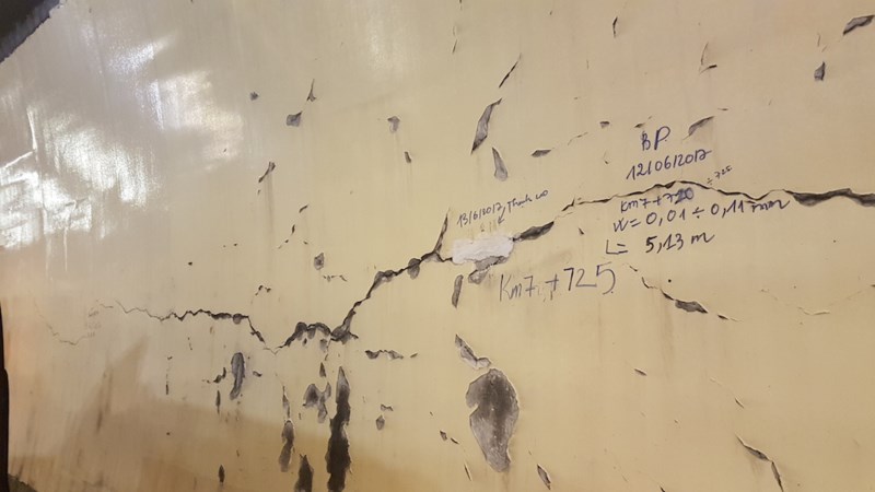 Hai bên thành hầm, các vết nứt hình chân chim, vết nứt dài, ngắn loang lổ nhưng chủ yếu tiết diện vết nứt dưới 1mm. Quan sát bằng mắt thường các vết nứt này rất nghiêm trọng.