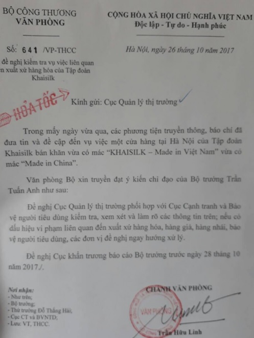 Văn bản số 641/VP-THCC của Bộ Công thương nêu rõ: “Trong mấy ngày vừa qua, các phương tiện truyền thông, báo chí đã đưa tin và đề cập đến vụ việc một cửa hàng tại Hà Nội của Tập đoàn Khaisilk bán khăn vừa có mác “KHAISILK – Made in Việt Nam” vừa có mác “Made in China”.