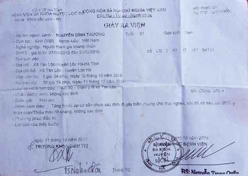 Ngày 10.10.2016, bệnh nhân Nguyễn Đình Trương (67 tuổi, trú xã Tân Lộc, huyện Can Lộc, Hà Tĩnh) thấy mệt nên gọi con dâu chở đi khám ở Bệnh viện Đa khoa huyện Lộc Hà. Sau thăm khám, bác sĩ chẩn đoán ông bị hen, do tăng huyết áp có sẵn "chưa xác định rõ gây biến chứng cho thai nghén, khi đẻ và sau khi đẻ, thận mạn/thiếu máu đề kháng/không xác định".