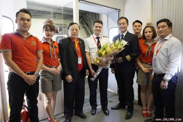 Lãnh đạo Vietjet chào đón và tặng hoa cho những hành khách đầu tiên trên chuyến bay khai trương.