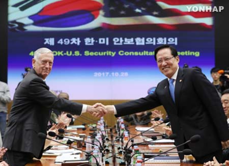 Theo KBS, Bộ trưởng Quốc phòng Hàn Quốc Song Young-moo và người đồng cấp Mỹ James Mattis hôm 29/10 đã tham dự Hội nghị an ninh thường niên Hàn-Mỹ (SCM) lần thứ 49 diễn ra tại trụ sở Bộ Quốc phòng Hàn Quốc tại Seoul.