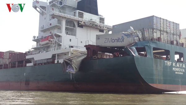Lúc này, trên tàu TRF KAYA Monrovia IMO 9330549 đang chở nhiều container hàng hóa. Cú đâm làm thân tàu bị hư hỏng, một số container bị xé toạc, nhiều hàng hóa rơi xuống sông, trong đó có một container chở cá basa đông lạnh xuất khẩu.