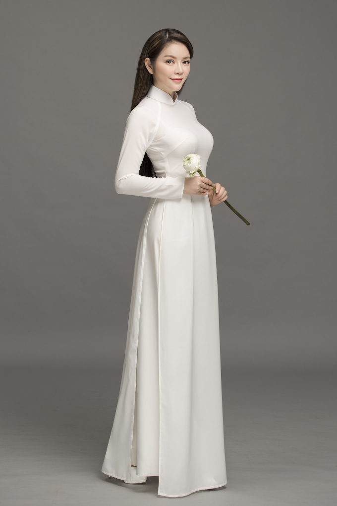Bộ áo dài trắng của Thuận Việt được thiết kế theo phom dáng truyền thống với phần cổ cao, tay áo dài, ôm sát vóc dáng Lý Nhã Kỳ. Chất liệu voan và lụa mềm góp phần tôn trọn số đo 3 vòng gợi cảm của cô.