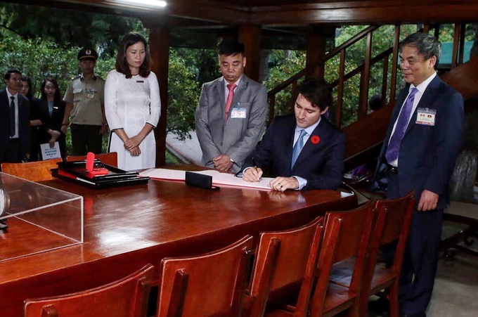 Ông Trudeau đã để lại bút tích trên sổ lưu niệm của Nhà sàn. "Thật là một không gian đẹp và một phần quan trọng của lịch sử", ông viết.