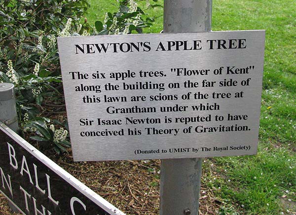 Biển hiệu ghi tên cây táo của Isaac Newton.