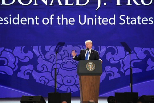 Tổng thống Mỹ Donald Trump hôm qua phát biểu tại Diễn đàn Hợp tác Kinh tế châu Á - Thái B́nh Dương ở Đà Nẵng. Ông sử dụng hai chiếc máy nhắc chữ có tấm kính trong suốt.